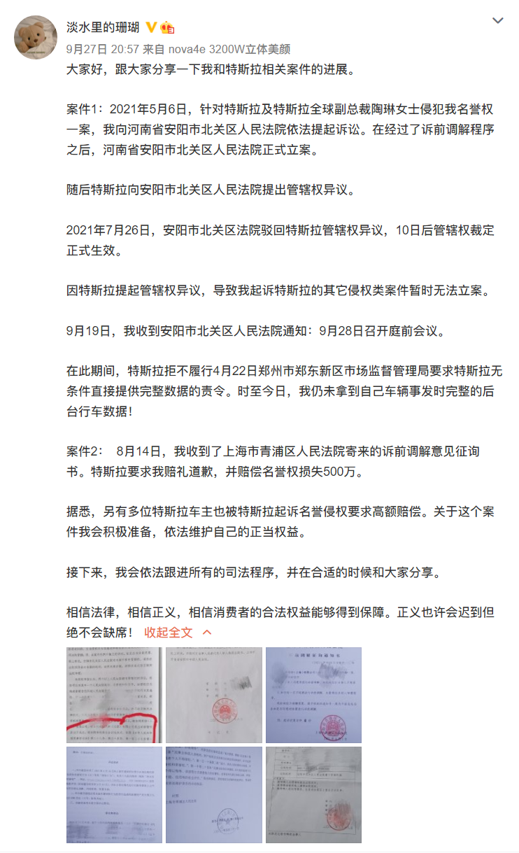 9月27日,上海车展维权女车主在微博上发文,称自己也被特斯拉索赔500万元,一个是自己与特斯拉对外事务副总裁陶琳的名誉权纠纷,一个是自己与特斯拉品牌的名誉权纠纷。关于维权车主与特斯拉对外事务副总裁陶琳的名誉权纠纷:此前,张女士曾公开表示,在没有任何占据的情况下,特斯拉公司以及特斯拉对外事务副总裁陶琳发布了一些不实言论,已经对个人以及家人的工作造成了严重影响。张女士认为,原告作为一名普通车主,因出现...