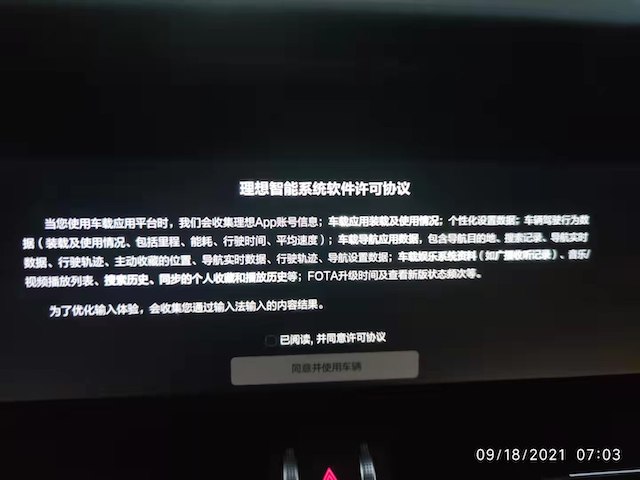 据《第一财经》报道,一名2020款理想ONE车主向其反映称,“我昨晚(9月18日)0点的时候车机升级,早上上车屏幕上就显示了这些协议,并且没有不同意的选项,只有选择同意才能继续使用汽车。”根据车主提供的协议显示,“当您使用车载应用平台时,我们会收集理想App账号信息;车载应用装载及便用况;个性化设置数据;车辆驾驶行为数据(装载及使用情况、包括里程、能耗、行驶时间、平均速度);车载导航应用败据,包含...