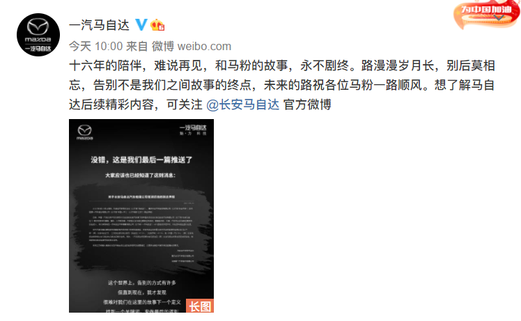 8月30日,一汽马自达官方发布最后一篇推送,正式官宣退出中国汽车的历史舞台!在微博上,一汽马自达感慨道:十六年的陪伴,难说再见,和马粉的故事,永不剧终。路漫漫岁月长,别后莫相忘,告别不是我们之间故事的终点,未来的路祝各位马粉一路顺风。在“没错,这是我们最后一篇推送了”,一汽马自达表示。在这篇推送中,一汽马自达回顾了自己的起点,同时也感慨自己的终点“路漫漫岁月长,别后莫相忘”。资料显示,一汽马自达一...