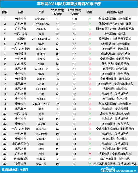 据车质网统计,2021年8月受理车主有效投诉信息9,624宗,环比下降约1.3%,同比则下降4.8%。从整体来看,榜单前十车型大部分来自合资品牌,但是自主品牌的表现也不好,长安UNI-T、广汽AionS等车型投诉量居前。具体到车型来看,8月份投诉量最高的车型是长安UNI-T,终结了一汽-大众探岳连续霸榜的历史,这也是该车历史上首次位列月度投诉榜单第一位,当月累计投诉量达199宗,是唯一一款投诉量超...