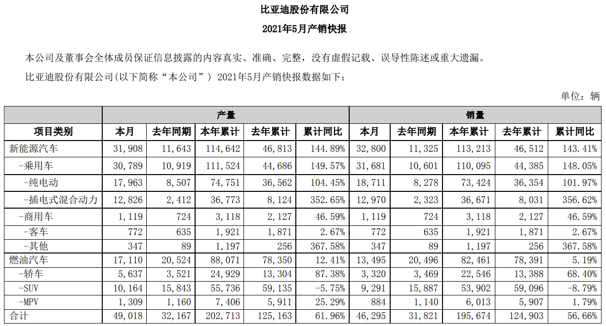 6月7日,比亚迪汽车公布最新数据显示,5月份汽车销量为46,295辆,同比增长45.49%;1-5月累计汽车销量为195,674辆,同比增长56.66%。新能源汽车的表现较为强势。数据显示,2021年5月比亚迪新能源汽车销量32800辆,同比增长189.62%;1-5月累计销量为113213辆,同比增长143.41%。至于燃油车方面,5月份燃油车销量为13,495辆,同比下滑34.16%;1-5月...