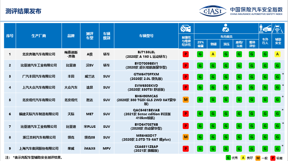 6月9日,中保研C-IASI公布2020年第二批车辆碰撞成绩结果,这一批车型总共涉及8个汽车品牌共计九款车型,分别为上汽大众途昂、北京奔驰A级、比亚迪汉EV、比亚迪宋PLUS、广汽丰田威兰达、北京现代胜达、天际ME7、荣威iMAX8、吉利领克05。整体来看,大部分车型的碰撞成绩还是不错的,不管是造车新势力的天际ME7还是传统汽车品牌的领克05、丰田威兰达等车型,整体成绩都算是比较优秀。首先来看一下...