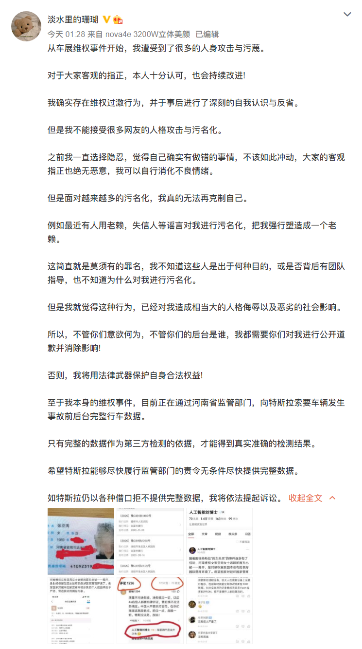 6月9日凌晨,上海车展特斯拉维权女车主在社交平台上再次发声。张女士表示,自从车展维权事件开始,就遭受到很多人身攻击与污蔑,有人用老赖、失信人等谣言来污蔑她。面对越来越多的污名,她不再选择容忍,要求相关人员公开道歉并消除影响,否则将采用法律来维护自己权益。张女士坦言,自己确实存在维权过激行为,并于事后进行了深刻的自我认识与反省,但是不能接受很多网友的人格攻击与污名化。张女士表示,此前自己一直选择隐忍...