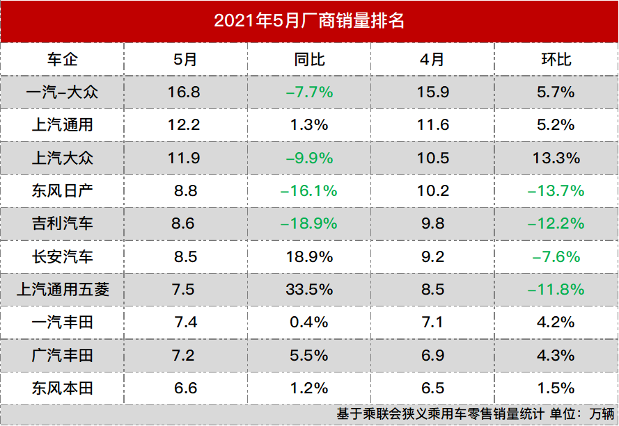 6月8日,乘联会发布最新报告显示,2021年5月国内狭义乘用车零售量为157.6万辆,同比2020年5月下滑2.6%,环比2021年4月下滑4.8%。1-4月狭义乘用车零售累计805.4万辆,同比增长42.0%,增速明显放缓。从乘联会公布的厂商狭义乘用车零售销量数据来看,前十排名中有四家车企销量出现同比下滑,也有四家车企出现环比下滑,最大跌幅均超过两位数。从排名来看,前三车企依旧是一汽-大众、上汽...
