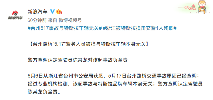 据媒体报道,5月17日台州路桥交通事故原因已经查明:经过专业机构检测,该起事故与特斯拉品牌车辆本身无关,警方查明认定驾驶员陈某龙负全责。据此前报道,5月17日浙江省台州市发生一起交通事故,一辆特斯拉撞倒两名正在处理事故的交警,且两名交警受伤不轻,地上有明显血迹,特斯拉损伤明显。 当日晚间,台州交警官方发布警情通报:5月17日17时15分许,陈某龙驾驶小型轿车,途经...