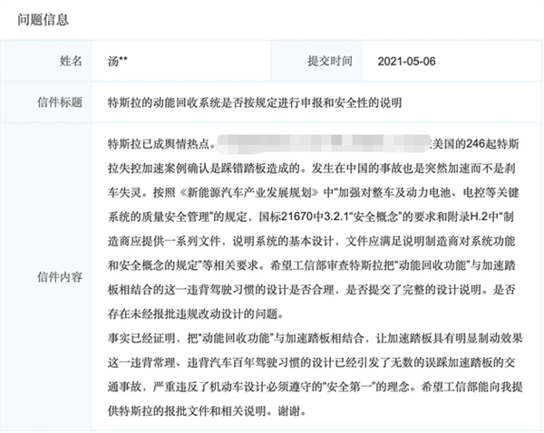 据工信部官网,日前有网友就“特斯拉的动能回收系统是否按规定进行申报和安全性”给工信部留言。该网友表示,把“动能回收功能”与加速踏板相结合,让加速踏板具有制动效果,违背汽车驾驶习惯,引发了无数误踩加速踏板的交通事故。希望工信部审查特斯拉该设计是否合理,是否提交了完整的设计说明。对此,工信部在部长信箱回应:制动能量回收与单踏板驾驶模式都是新能源汽车的新技术之一。这些技术并不是特斯拉特有技术,用户在购买...