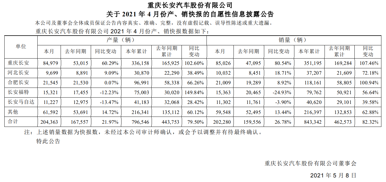 5月8日,长安汽车公布最新数据显示,4月长安汽车销量为202,280辆,同比增长26.78%;1-4月累计销量为843,342辆,同比增长82.32%。从长安汽车的销量结构来看,自主品牌的表现远优于合资品牌,长安福特、长安马自达均出现下滑。长安福特是长安汽车集团跌幅最大的品牌。数据显示,4月长安福特销量仅为15,363辆,同比下滑24.93%。1-4月累计销量为79,762辆,同比增长56.64%...