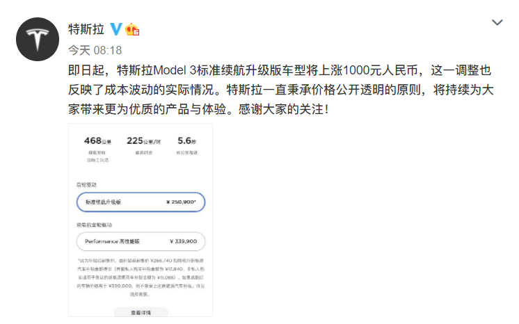 5月8日,特斯拉中国官方宣布,国产Model3标准续航升级版上涨1000元,当前售价为25.09万元,交付周期为2-4周。Model3Performance高性能版售价保持不变,依旧是33.99万元。值得一提的是,就在昨日,特斯拉美国也宣布涨价,Model3标准续航升级版和长续航版、ModelY长续航版的售价均上调500美元(约合人民币3215元)。据统计,这是特斯拉美国近两月来第四次对Model...