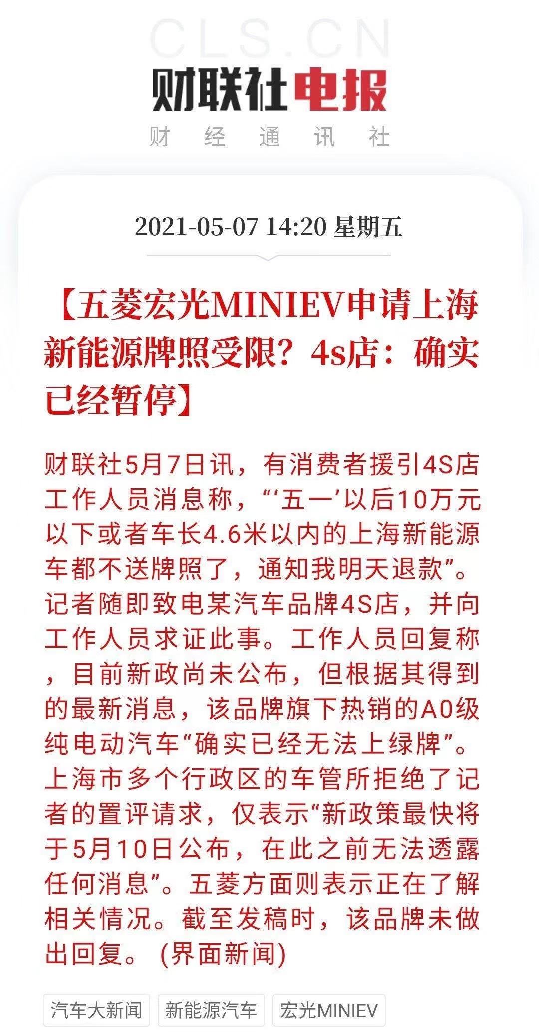 据界面新闻报道,有消费者援引4S店工作人员消息称“五一假期后10万元以下或车长4.6米以下的上海新能源车都不送牌照了。”在某汽车论坛上了解到,此前就有车友在论坛上反映,新款的五菱宏光MINIEV无法在上海获得新能源牌照。对此,有媒体联系相关4S店询问,工作人员表示“目前新政尚未公布,但该品牌旗下热销的A0级纯电动车确实无法上绿牌。”此外,上海多个车管所也表示,“新政策最快将于5月10日发布,在此之...
