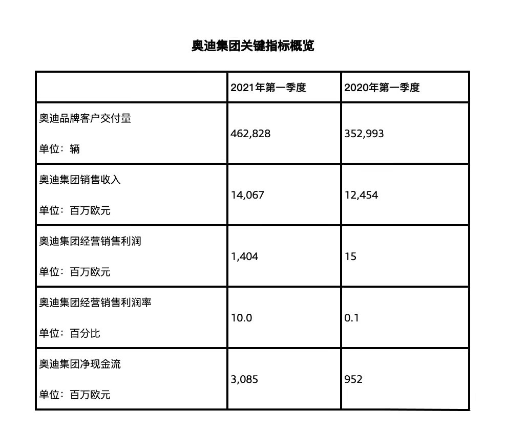 5月8日,奥迪发布2021年第一季度财报数据显示,一季度奥迪集团销售收入为141亿欧元,同比增长12.9%;经营销售利润为14亿欧元,经营销售利润率为10.0%,税前利润为17亿欧元。销量方面,奥迪品牌一季度销量为462828辆,相比受疫情影响的2020年一季度增长了31%。奥迪表示,一季度奥迪在Q系列车型和高端车型销量方面取得了显著增长。分区域来看,中国市场是奥迪品牌的最大的市场,今年一季度奥迪...