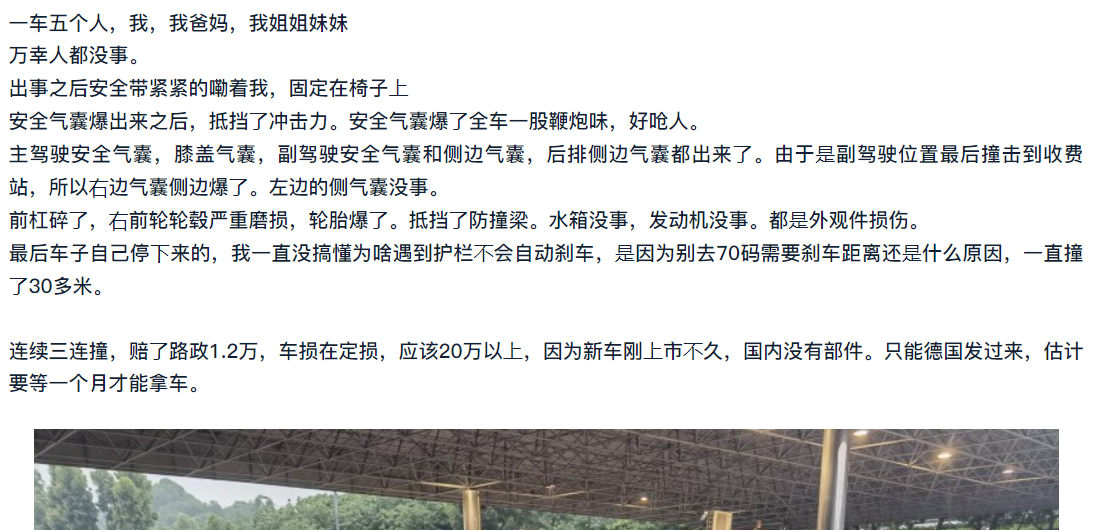 全新奔驰S级刚在国内上市不久,就有一位车主因为疏忽而发生国内首撞。据奔驰S级车主在论坛上发文称,五一的时候该车主驾驶全新S级出行,“S级的舒适度加上高级智能驾驶辅助,超级容易想睡”,导致该车在高速公路服务区出口处发生碰撞,所幸车上五人均没有受伤。据车主介绍,这辆奔驰S级还没有上牌,本来预约6号上牌的,现在又要等一个月的时间。从车主发布的图片来看,奔驰S级撞到了高速公路出口的左右护栏,导致其前保险杠...