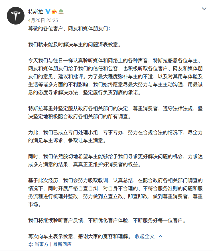 “拒不妥协”的特斯拉终于道歉了!4月20日晚间,特斯拉发文公开致歉,对未能及时解决车主问题深表歉意。特斯拉在文中写道,尊重并坚定服从政府各相关部门的决定,尊重消费者,遵守法律法规,坚决坚定地积极配合政府各相关部门的所有调查。特斯拉已成立专门处理小组,尽全力的满足车主诉求,争取让车主满意。特斯拉表示,为了最大程度弥补车主的不适,以及对其用车体验及生活等诸多方面的不利影响,特斯拉始终愿意尽最大努力与车...