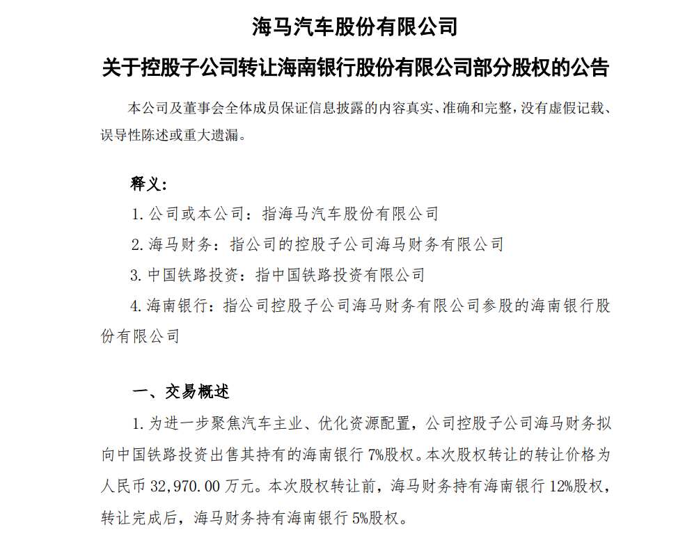 2月5日,ST海马发布公告称,其控股子公司海马财务拟向中国铁路投资出售其持有的海南银行7%股权,转让价格为3.297亿元。据了解,转让之前海马财务持有海南银行12%股权,转让之后海马财务持有海南银行5%股权。海马表示,此举主要为进一步聚焦汽车主业、优化资源配置。目前,公司董事会已通过《关于控股子公司转让海南银行股份有限公司部分股权的议案》,但是交易事项仍需国家银行监督管理机构批准。数据显示,202...