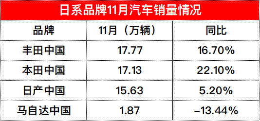 12月4日,包括丰田、本田、日产、马自达在内的四家日系品牌陆续公布最新月度销售数据。总体来看,四大日系品牌在11月份的表现喜忧参半,“两田”销量增幅均在两位数以上,马自达两位跌幅与“两田”形成反差,日产则实现5.2%小幅度增长。根据丰田公司最新发布的数据,11月份丰田在华销量为17.77万辆,同比增长16.7%。丰田推出的全新车型或换代产品,包括卡罗拉、雷凌、RAV4荣放、凯美瑞等市场表现较好,其...