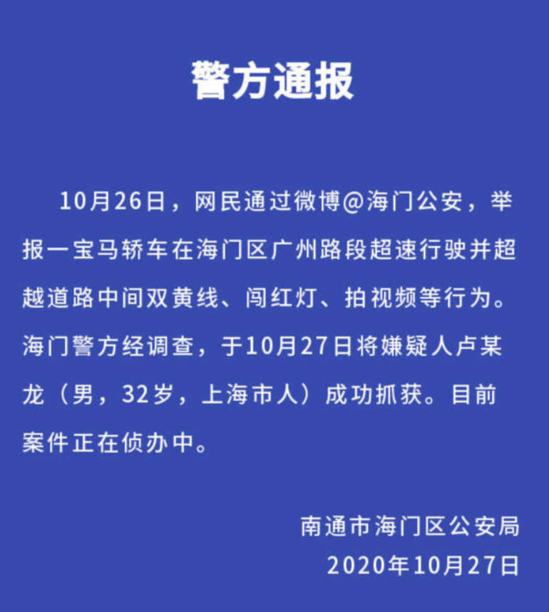 “宝马单手飙车时速到255公里”的事件有了新进展。据江苏省南通市海门区公安局通报,一辆宝马车在海门广州路段超速行驶并超越道路中间双黄线、闯红灯、拍视频等行为,海门警方经调查,于27日将嫌疑人卢某龙抓获,目前案件正在侦办中。据此前报道,一段飙车视频在网络热传,视频中驾驶人单手开宝马,一路加速至接近时速260公里,期间还一度逆行。网友根据视频比对地图街景,拍摄地疑为江苏省南通市海门区广州路...