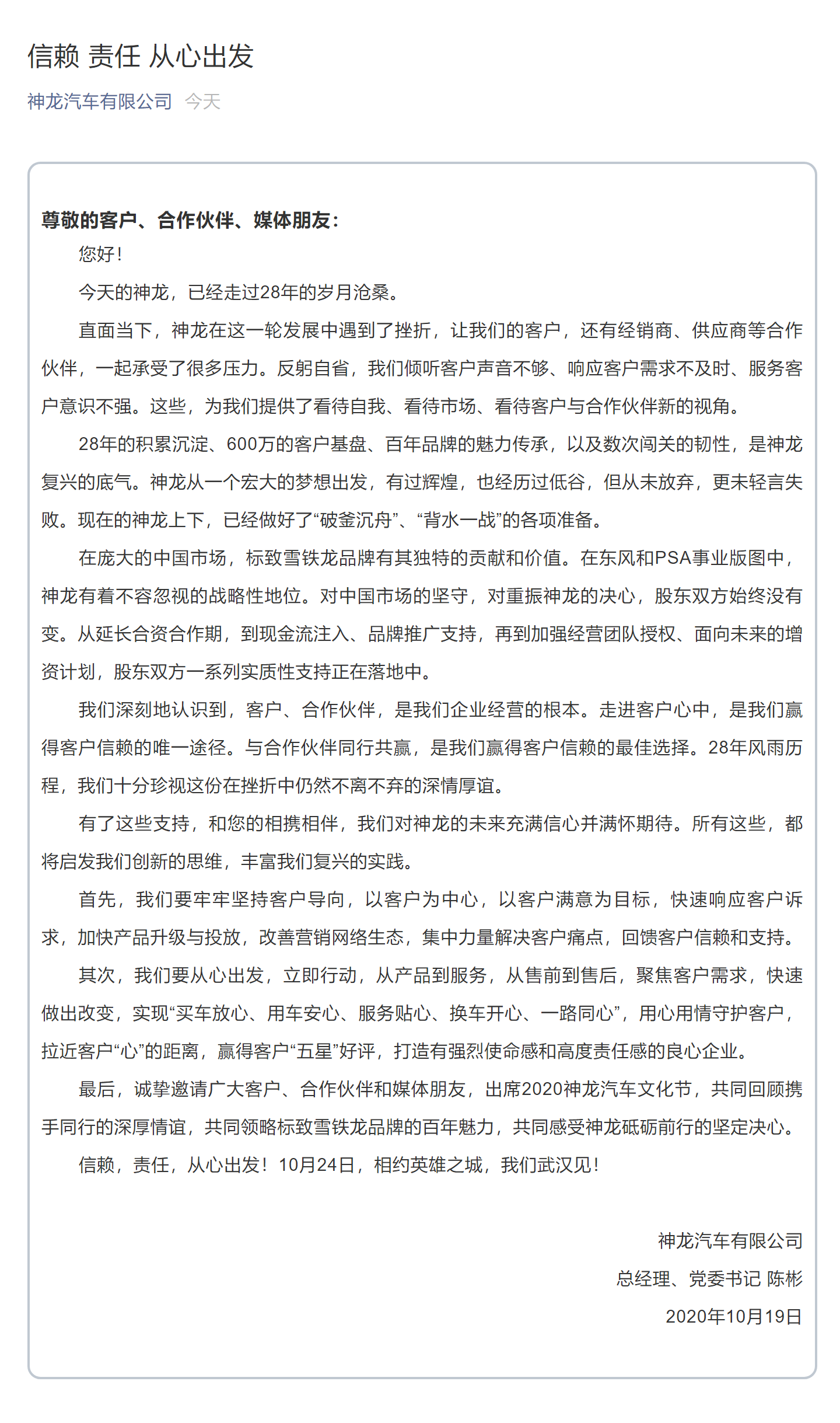 10月19日,神龙汽车在其官微发布公开信称,当下神龙汽车在发展中遇到了挫折,让我们的客户、经销商和供应商等合作伙伴承受了很多压力。神龙汽车表示,现在神龙汽车上下,已经做好了“破釜沉舟”、“背水一战”的各项准备。资料显示,神龙汽车是东风汽车和PSA集团在1992年共同出资成立的合资公司,旗下拥有标致和雪铁龙两大汽车品牌。从时间来看,神龙汽车进入中国市场的时间并不晚,但是目前却沦为最惨合资车企之一。2...