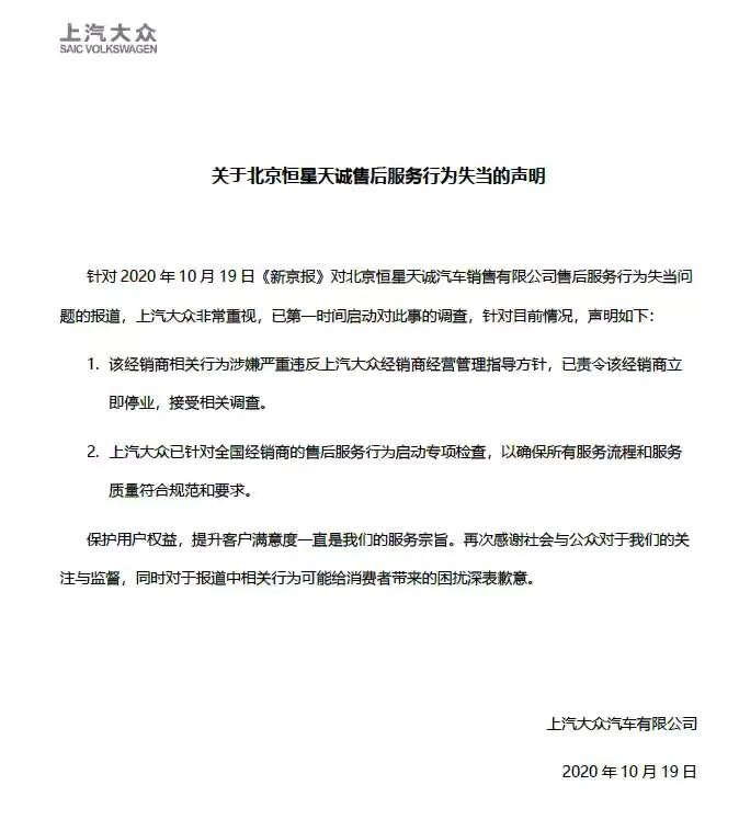 据媒体报道,在上汽大众北京恒星天诚4S店及东风日产晟通专营店的暗访过程中,新京报记者发现两家4S店员工存在虚假定损、虚假清洗保养,截留超量油液等问题。针对以上报道,上汽大众发布声明回应称,“已责令该经销商立即停业,接受相关调查;针对全国经销商的售后服务行为启动专项调查”。