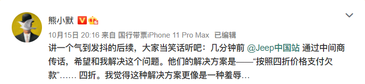 10月16日,微博博主“熊小默”发布长文称,Jeep中国拖欠其项目尾款174000元人民币薪酬,这笔钱已经拖欠了16个月。根据该博主的描述,“熊小默”作为项目临时召集人,代表另外四名创作者和激创广告签订了一份合同,由于上线日期紧迫,客户表示只能先给一点预付款,事后三个月再付尾款,但谁曾想这个尾款竟然拖欠了16个月之久。该微博发出后,多名创作作者也转发自曝与Jeep中国存在拖欠劳务费的情况。针对此事...