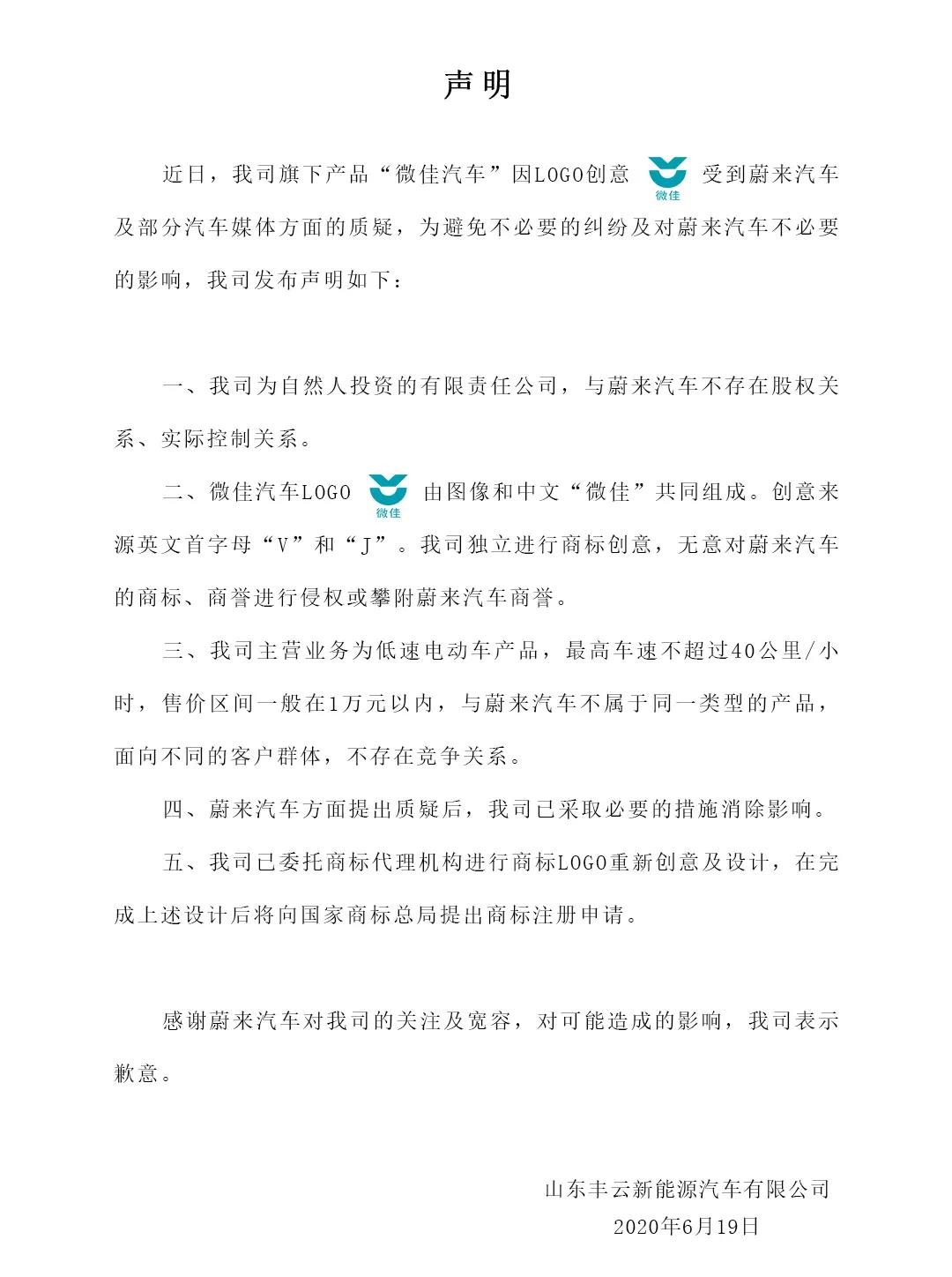 近日,微佳汽车品牌标识“撞脸”蔚来汽车的事件在网上遭到热议后,微佳汽车母公司山东丰云新能源汽车有限公司发布《声明》回应品牌标识抄袭事件,其在公告中称无意对蔚来汽车的商标、商誉进行侵权或攀附蔚来汽车商誉,针对撞标事件,公司已委托商标代理机构进行商标LOGO重新创意及设计,在完成上述设计后将向国家商标总局提出商标注册申请。时隔三天后,微佳汽车在其官方微信号发布全新品牌标识,官方头像也更换成最新的LOG...