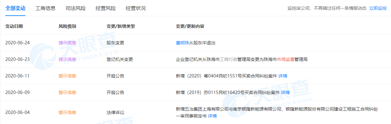 董明珠梦起银隆,梦碎银隆?据媒体报道,银隆新能源股份有限公司于6月24日发生工商变更,董明珠从股东中退出。不过,银隆新能源在今日发布声明称,“媒体报道‘银隆新能源股份有限公司发生工商变更,董明珠从股东中退出’等相关新闻严重失实,公司股东董明珠女士股权未发生任何变更。”值得一提的是,通过天眼查查询发现董明珠已不在银隆新能源股东名单中。公开资料显示,银隆新能源股份有限公司成立于2008年,总部位于广东...