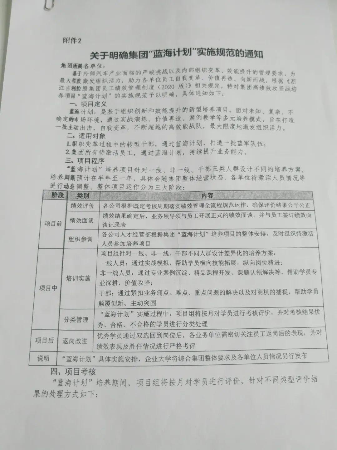据媒体援引吉利汽车内部员工曝光,吉利汽车“蓝海计划”被质疑“变相裁员”,比例大概为普通员工裁员20%、管理层优化30%。据吉利集团4月份发布分一份通知显示,所谓“蓝海计划”是基于组织创新与效能提升的新型培养项目,面对未知、复杂、不确定的市场环境,通过实战演练、价值再造等,旨在打造一批主动高效能战队。该计划适用于组织变革中转型干部和待激活员工,针对的是一线、非一线、干部类三类人群设计不同方案,培养周...