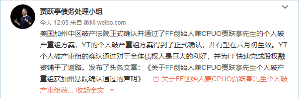 据贾跃亭债务处理小组消息,历经7个月的申请、谈判、投票和法院确认,贾跃亭的个人破产重组终于获得了加州中区破产重组法院的最终确认和通过,这意味着个人破产重组正式进入生效流程。根据贾跃亭个人破产重组方案,贾跃亭将把个人持有的全部FF股权转入债权人信托,作为FF创始人的贾跃亭将不再持有FF股权,但是仍会以CPUO的身份带领FF发展。简而言之,贾跃亭的债务将与FF未来的发展关联,如果FF未来盈利,那么债权...