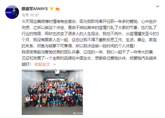 5月8日,爱驰汽车执行副总裁蔡建军在微博发布长文称“即将离开任职一年多的爱驰,由于突如其来的疫情打乱了行业的格局,同时也改变了很多人的人生观念,从疫情爆发至今的3个月,我没有跟家人在一起,这也让我不得不重新反思工作、生活,事业、家庭的关系,所以我决定做一段时间的个人休整!”对此,爱驰汽车联合创始人兼总裁付强表示,虽不舍但尊重其决定。蔡建军是在2018年12月加入爱驰汽车的,担任爱驰汽车执行副总裁,...