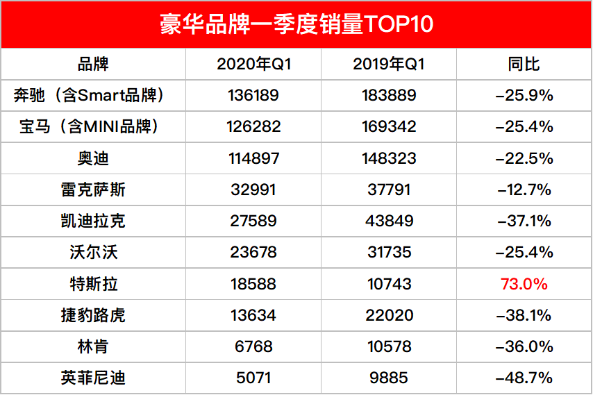 中汽协数据显示,一季度汽车销量为367.2万辆,同比下降42.4%。受疫情影响,2020年一季度国内车市下行压力较大,在这种背景下,豪华品牌虽然跑赢了整体市场,但是下跌的趋势仍然不可避免。整理数据得出了一季度豪华品牌在华销量排行榜,从排名榜单来看,梅赛德斯-奔驰(含Smart品牌)以136189辆夺得冠军,宝马(含MINI品牌)与奔驰相差9907辆,以126282辆的成绩暂居第二。另外,特斯拉成为...