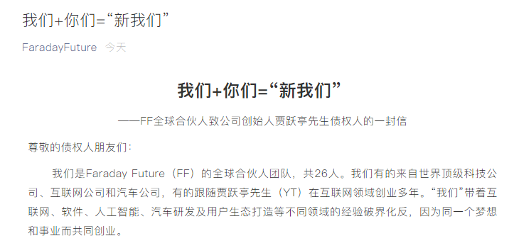 据FaradayFuture公众号,FF全球合伙人发布致公司创始人贾跃亭先生债权人的一封信。FF在信中指出,希望所有债权人能为FF创始人贾跃亭的破产重组投出赞成票,只有FF取得巨大成功,贾跃亭才能实现足额甚至是超额还清债务,实现对债权人尽责到底的愿望,FF打造共享智能出行生态系统、变革汽车产业的梦想才能实现。FF同时强调,FF91距离量产只有一步之遥,六年来FF已经提交了近1500个专利申请,专利...