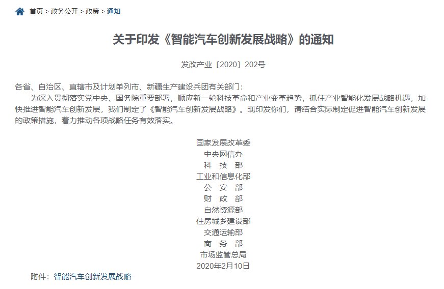 为顺应新一轮科技革命和产业变革趋势,抓住产业智能化发展战略机遇,加快推进智能汽车创新发展,2月24日,国家发展改革委发布“关于印发《智能汽车创新发展战略》的通知”,根据《战略》,到2025年,中国标准智能汽车的技术创新、产业生态、基础设施、法规标准、产品监管和网络安全体系基本形成。实现有条件自动驾驶的智能汽车达到规模化生产,实现高度自动驾驶的智能汽车在特定环境下市场化应用。智能交通系统和智慧城市相...