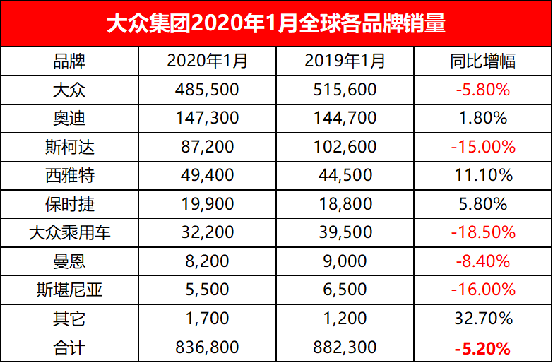 据大众集团官方数据显示,今年1月大众集团全球销量为836800辆,较去年同期下滑5.2%,下滑的主要原因还是因为中国市场突发疫情以及传统的销售淡季从而影响销量。大众集团旗下拥有12个品牌,包括大众、奥迪、斯柯达、奥迪、保时捷、西雅特等。其中大众品牌最为畅销,根据大众集团数据显示,大众品牌在今年1月全球销量为485500辆,同比下滑5.8%。其次便是奥迪品牌,最为大众集团的一线豪华品牌,其1月全球销...