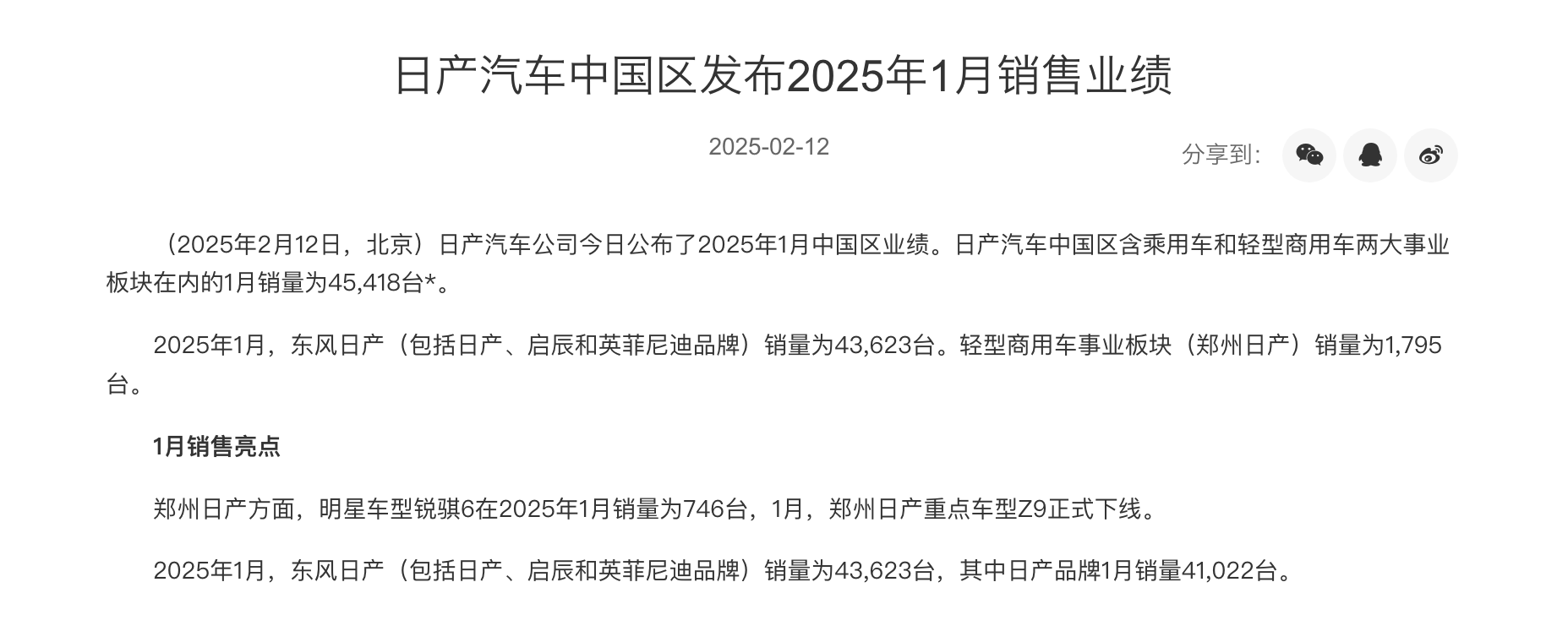 2月12日,日产汽车公布2025年1月中国区业绩。数据显示,日产汽车中国区含乘用车和轻型商用车两大事业板块在内的1月销量为45418辆(包含英菲尼迪进口车型),同期为65553辆,同比下滑30.7%。具体来看,1月东风日产(包括日产、启辰和英菲尼迪品牌)销量为43,623辆,同比下滑29.8%;轻型商用车事业板块(郑州日产)销量为1795辆,同比下滑47.5%;零售数据显示,1月日产品牌销量最高的...