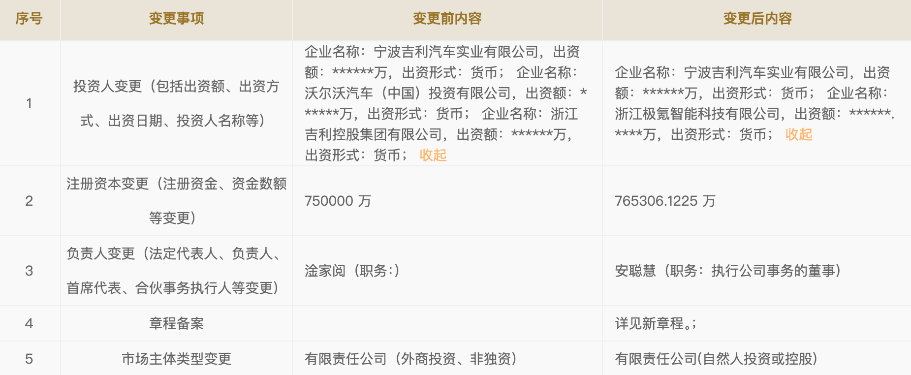 据全国企业信息信用公式系统显示,领克汽车科技有限公司(下称“领克汽车”)发生工商变更,沃尔沃汽车(中国)投资有限公司、浙江吉利控股集团有限公司退出股东行列,新增浙江极氪智能科技有限公司(下称“极氪汽车”)为股东。变更后,领克汽车由宁波吉利汽车实业有限公司(下称“宁波吉利”)与极氪汽车共同持股,各股东持股比例尚未公布。根据变更前工商信息显示,领克汽车成立于2017年10月20日,是吉利与沃尔沃共同合...
