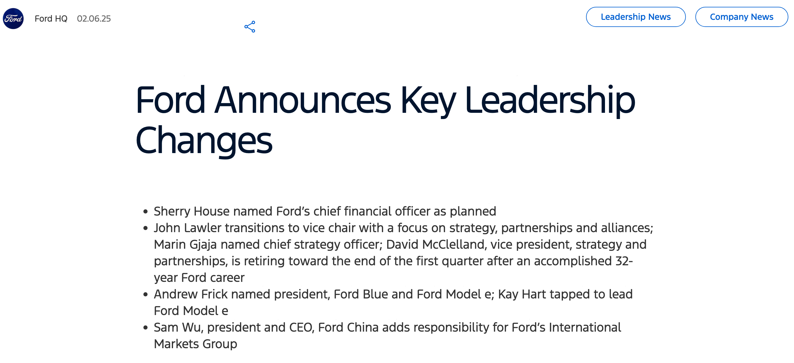 2月7日,美国福特汽车发布最新人事任命,现任福特汽车公司副总裁、福特中国总裁兼首席执行官吴胜波将在现有职责范围基础上,兼管福特汽车国际市场集团(IMG)业务。此外,福特汽车任命雪莉·豪斯(SherryHouse)为首席财务官;现任福特汽车副董事长、首席财务官约翰·劳勒(JohnLawler)转任副主席,专注于战略、伙伴关系和联盟;ModelE电气化部门首席运营官马林·贾亚(MarinGjaja)被...