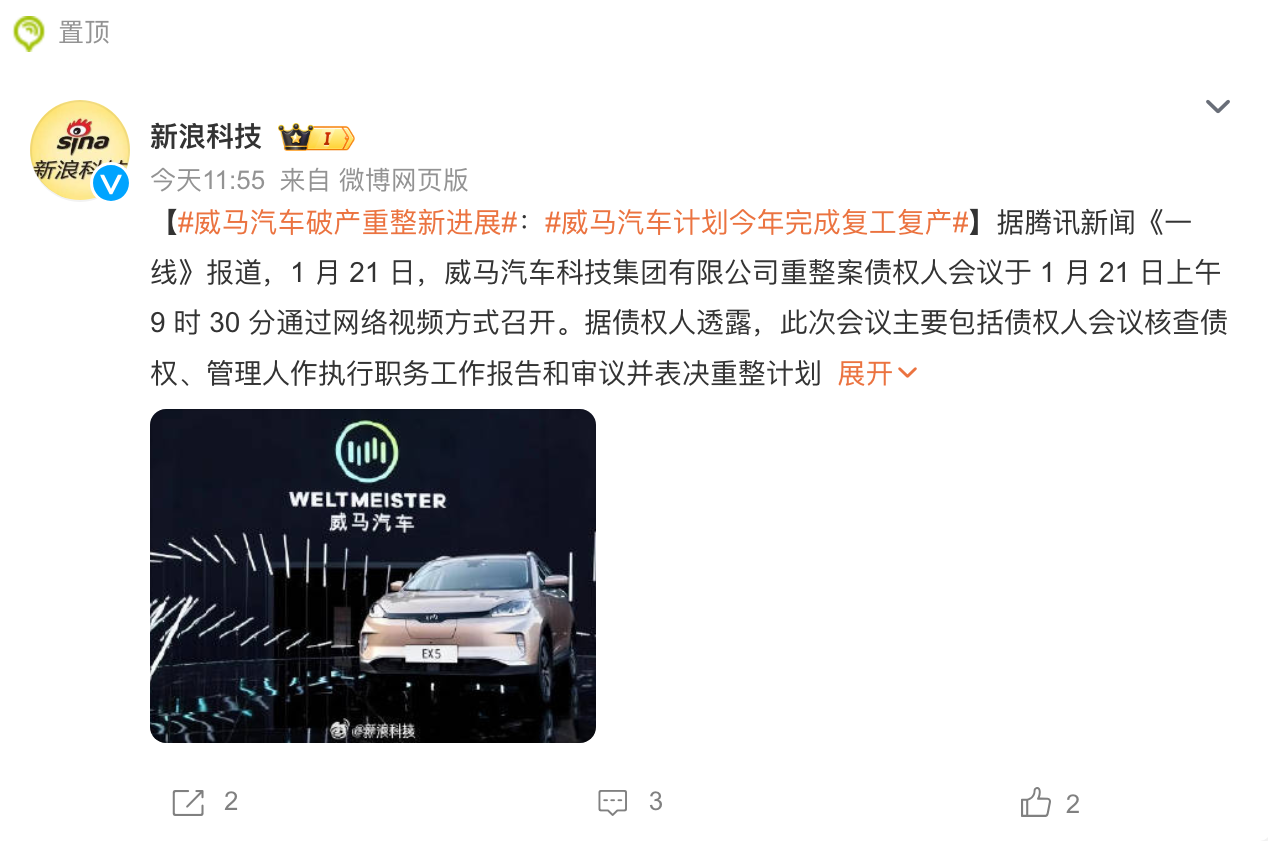 据媒体报道,1月21日,威马汽车科技集团有限公司重整案债权人会议通过网络视频方式召开。据债权人透露,此次会议主要包括债权人会议核查债权、管理人作执行职务工作报告和审议并表决重整计划(草案)等三项议程。此前信息显示,上海三中院于2024年12月10日作出裁定,裁定将威马智慧出行科技(上海)股份有限公司、苏州威马智慧出行科技有限公司、威马汽车制造温州有限公司以实质合并重整方式纳入威马汽车科技集团有限公...