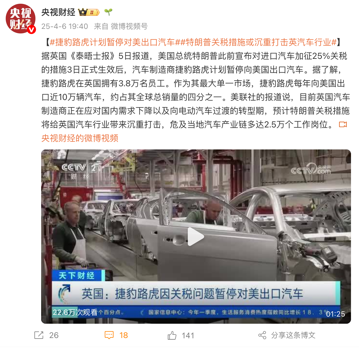 据央视财经报道,美国对进口汽车加征25%关税的措施于4月3日正式生效后,为应对其带来的成本上涨,捷豹路虎决定从4月7日起暂停对美国出口汽车,为期一个月。报道称,尽管在关税措施生效前,捷豹路虎已在美国囤积了两个月的库存,但公司正在考虑采取提高在美售价、降低成本以及转向其他市场等措施,应对关税带来的冲击。捷豹路虎在一份声明中表示,在关税措施生效前,捷豹路虎已在美国囤积两个月的库存 ,这些库存...