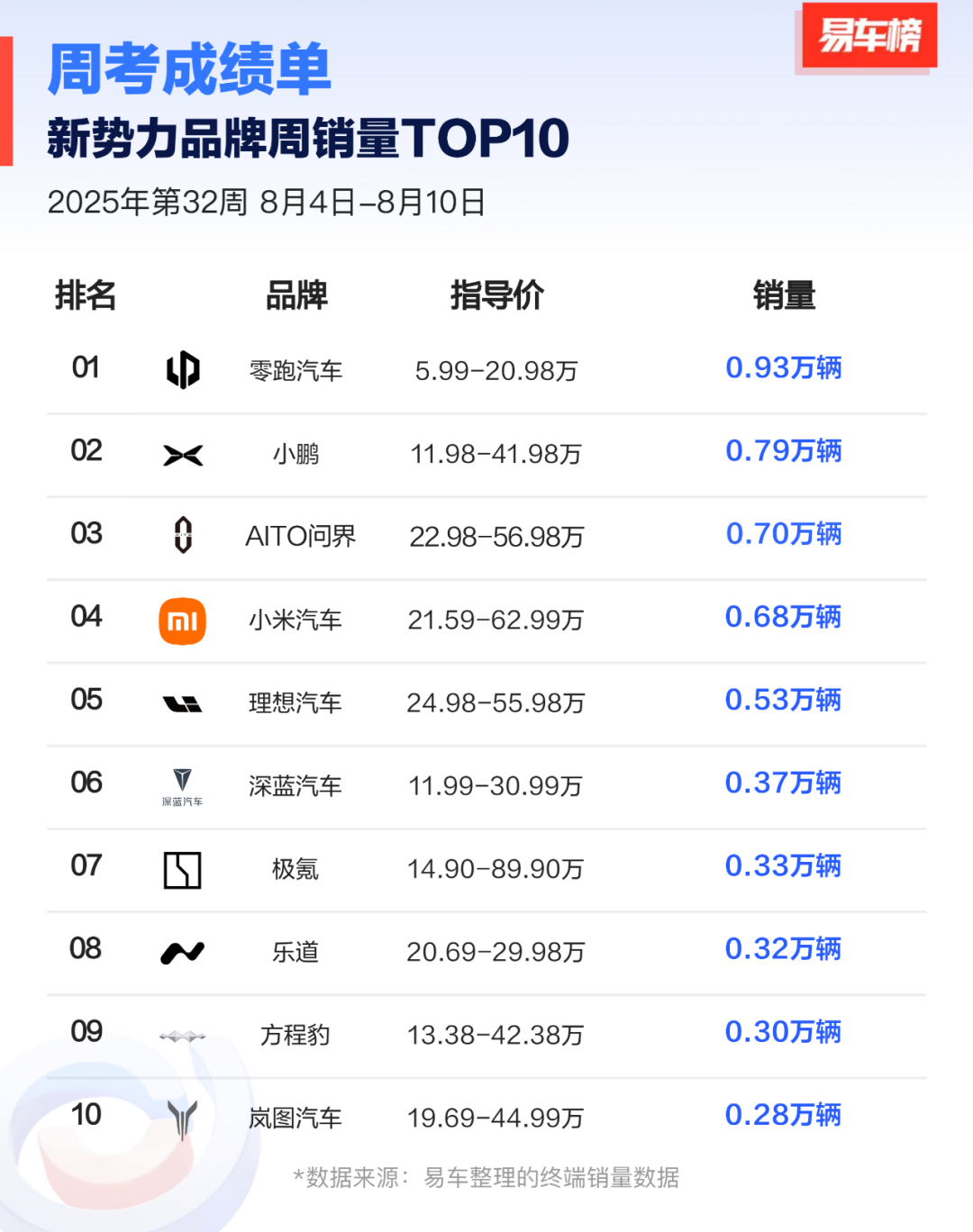8月12日周二,一份由易车发布的“新势力周销量榜单”出炉,统计时间为2025年8月4日-8月10日,也就是2025年第32周。从统计的榜单来看,零跑汽车以0.93万辆位居榜单,超过鸿蒙智行和小鹏汽车,零跑汽车在售车型包括T03、C01、C10、C11、C16、B10,其中零跑C10为0.22万辆,零跑B10为0.24万辆,零跑C11为0.18万辆,零跑C16为0.12万辆,零跑B10为0.16万辆...
