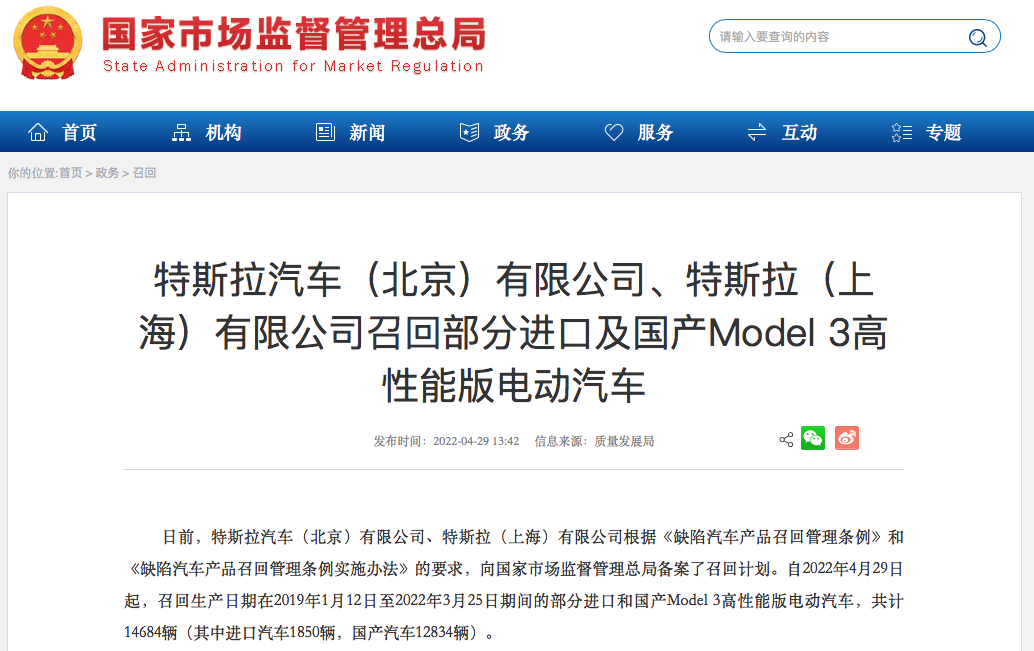 4月29日,国家市场监督管理总局发布了一则关于特斯拉召回通知,最新公告显示,特斯拉汽车(北京)有限公司、特斯拉(上海)有限公司根据《缺陷汽车产品召回管理条例》和《缺陷汽车产品召回管理条例实施办法》的要求,向国家市场监督管理总局备案了召回计划。据召回公告显示,自2022年4月29日起,召回生产日期在2019年1月12日至2022年3月25日期间的部分进口和国产Model3高性能版电动汽车,共计146...