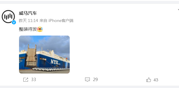 7月25日,威马汽车官方微博发布了一条内容为“整装待发”的消息,此外还配上一批新车在货轮前的照片。对于此次车辆出口的具体目的地,官方尚未透露。但据图片上的信息显示为“NYK LINE”(日本邮船株式会社)。实际上,对于此次威马汽车出口海外并不意外。近年来,威马汽车也在加快布局海外市场,早在去年7月威马EX5车型就获得了 WVTA欧盟大批量认证证书,今年7月威马E.5车型获得SS...