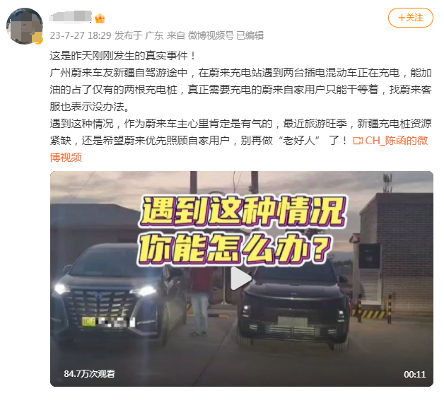 7月27日,有博主在微博发文称:广州蔚来车友新疆自驾游途中,在蔚来充电站遇到两台插电混动车正在充电,能加油的占了仅有的两根充电桩,真正需要充电的蔚来自家用户只能干等着,找蔚来客服也表示没办法。遇到这种情况,作为蔚来车主心里肯定是有气的,最近旅游旺季,新疆充电桩资源紧缺,还是希望蔚来优先照顾自家用户,别再做“老好人”了!从该博主发布视频可以看到,视频中的充电桩旁均停着插电混动车辆充电。该条博文一发出...