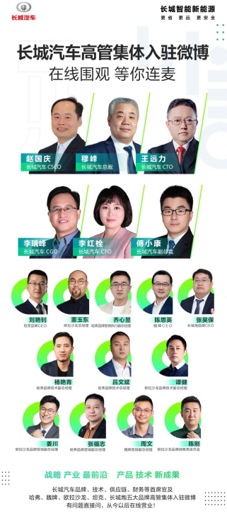 6月13日,长城15位高管集体开通微博个人账号。从宣传海报可以看到,此次入驻微博的长城高管覆盖了长城汽车旗下的五大品牌,分别有长城汽车总裁穆峰、长城汽车CTO王远力、长城汽车CSCO赵国庆、长城汽车CFO李红栓、长城汽车副总裁傅小康、魏牌CEO陈思英、坦克品牌CEO刘艳钊、长城炮品牌CEO张昊保、哈弗品牌技术总经理吕文斌、欧拉沙龙品牌技术副总经理谭健等人。一天内15位高管同时入驻微博,这一举动也瞬...