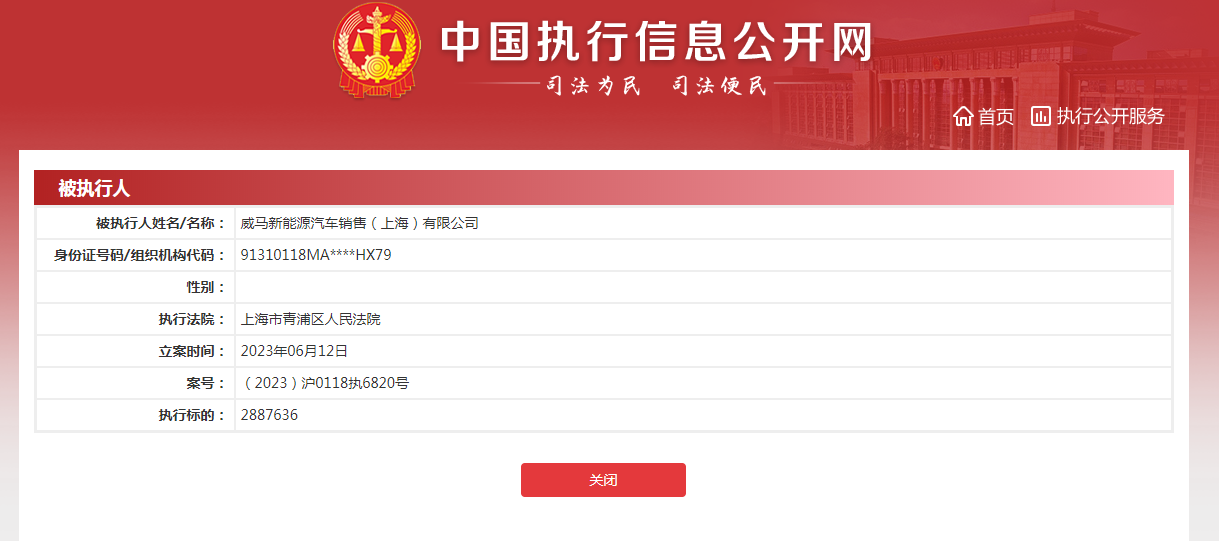 近日,据中国执行信息公开网显示,威马新能源汽车销售(上海)有限公司新增一条被执行人信息。信息内容显示,关联案件涉及服务合同纠纷,执行法院为上海市青浦区人民法院,被执行标的为288.76万余元。相关资料显示:威马新能源汽车销售(上海)有限公司在2018年3月成立,由威马汽车科技集团有限公司全资持股。法定代表人为周晨,注册资本5亿人民币,该公司经营范围有:汽车销售,汽车领域内的技术服务,机动车维修,二...