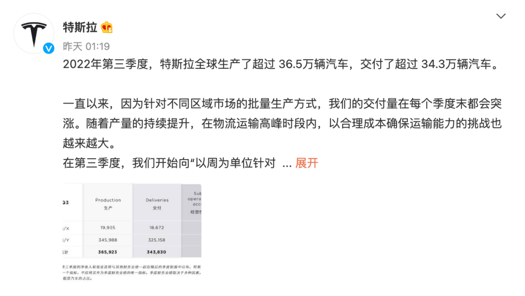 10月3日,特斯拉官方对外公布第三季度汽车产销数据。数据显示,2022年第三季度特斯拉全球生产365923辆汽车,交付343830辆汽车。其中,特斯拉第三季度MODEL 3/Y 交付量为325158辆,生产345988辆。第三季度MODEL S/X 交付量18672辆,生产19935辆。或第三季度交付量不及预期,在纳斯达克、道琼斯、标普指数集体暴涨的背景下,...