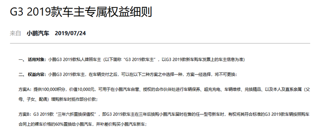 早前有一大批小鹏汽车车主因为2019款小鹏G3车主由于2020款小鹏G3在航程上巨大升级,价格反而下降的情况进行维权。对此小鹏汽车积极回应,第一时间组织处理公关事件,于今日早些时候在官网发布公告,对小鹏G3 2019款车主提出二选一的补偿方案。据了解,小鹏汽车今天通过官网发布了G3 2019款车主专属权益细则。根据细则,对已经完成交付的G3 2019款车主可以选择A、B两种补偿方案。方案A为提供1...