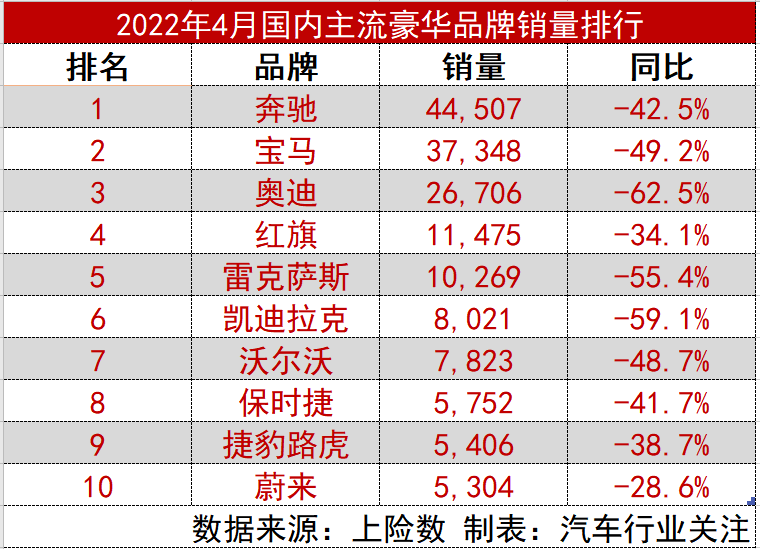 受疫情蔓延和零部件供应短缺影响,多家车企被迫停工或减产,导致4月汽车零部件厂商生产停滞,车市整体遭受严重冲击,其中豪华车市是受创最重的细分市场之一。据乘联会数据显示,2022年1-4月,累计销量排名前三的豪华轿车是宝马5系、奔驰E级和宝马3系,零售销量分别为57813辆、51585辆和50852辆,与去年同期相比均有不同程度下降。其中4月豪华车市场零售销量只有12万辆,同比下降54%,环比下降50...