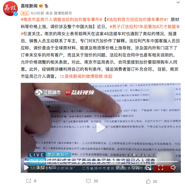 受当下大环境影响,汽车涨价已成为行业共识,不过,近日有消费者向媒体反映:订法拉利提车时被临时要求加8万,不加钱不给提车,不付尾款则没收50万定金,随后此事件在网上引发热议,与此同时,南京市监局也介入调查。5月31日,据荔枝新闻报道,去年3月4号,常州一名消费者吴先生在南京法拉利4S店订购了一辆价值354万的豪车,签了合同,并交了50万元定金。今年5月24号,吴先生去店里提车时,销售人员要求吴先生签...