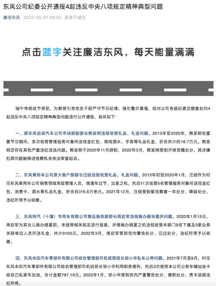 5月31日,东风汽车集团有限公司(下称“东风公司”)纪律检查委员会在官方微信公众号“廉洁东风”公开通报了公司内部4起违反中央八项规定精神典型问题。通报显示,这4起违反问题包括:原东风启辰汽车公司市场部副部长熊发明违规收受礼品、礼金问题;东风乘用车公司原大客户部部长汪结违规收受礼品、礼金问题;东风特汽(十堰)专用车有限公司售后服务部部长周启军违规操办婚丧喜庆问题;东风本田汽车零部件有限公司综合管理部...