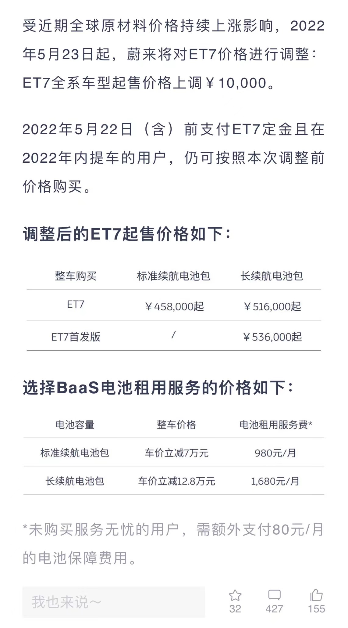 5月13日,蔚来官方宣布:受近期全球原材料价格持续上涨影响,自2022年5月23日起,蔚来ET7全系车型起售价格上调1万元。至于2022年5月22日(含)前支付ET7定金且在2022年内提车的用户,仍可按照本次调价前价格购买。目前,蔚来汽车旗下有ES8、ES6、EC6、ET7、ET5五款车型在售,其中ET7是蔚来首款轿车,于2021年1月9日举办的蔚来NIODay上正式发布并公布上市,新车根据电池...