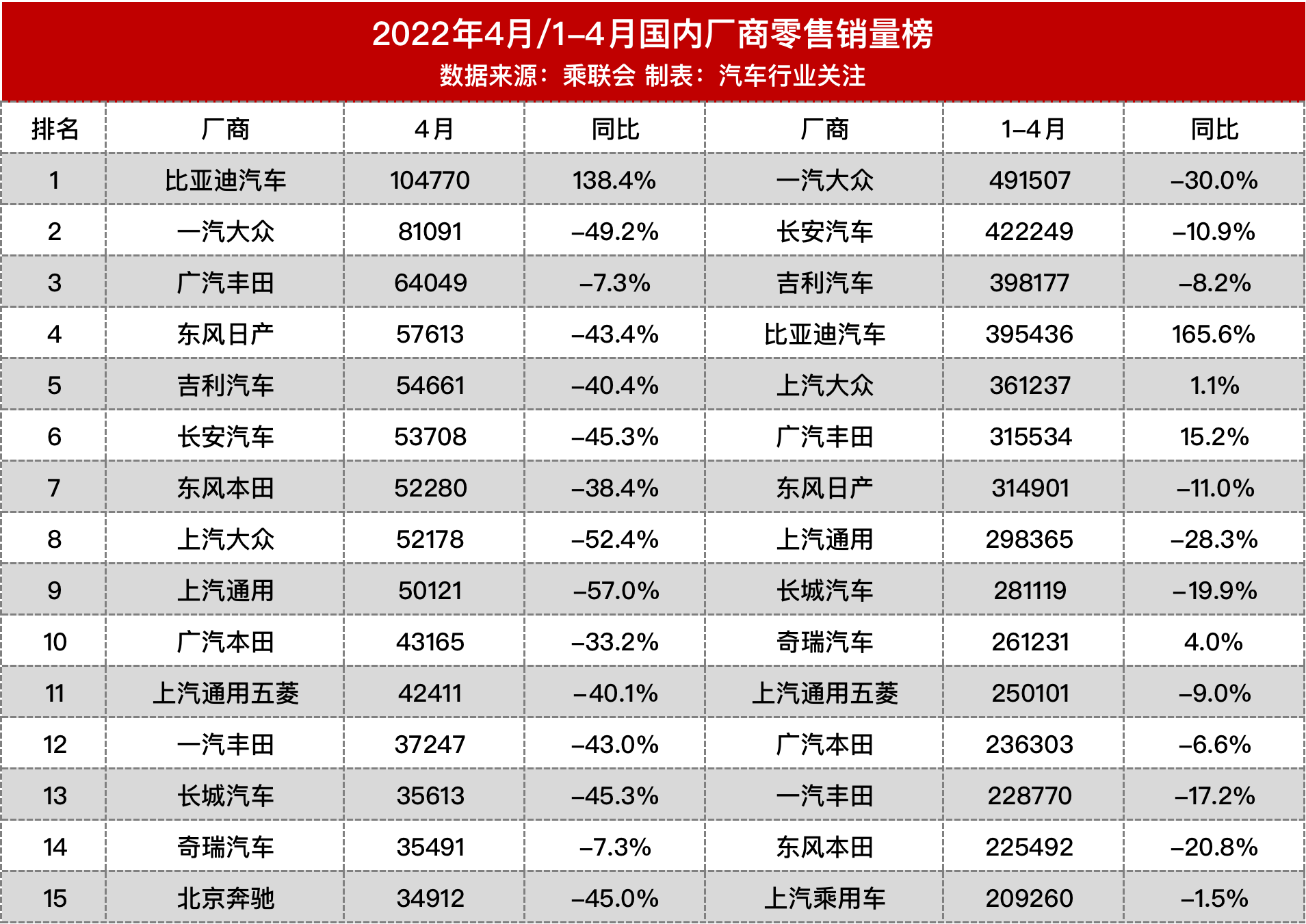 据乘联会数据显示,2022年4月乘用车市场零售104.2万辆,同比下降35.5%,环比下降34.0%。汽车行业关注分析,4月乘用车销量大幅下滑的主要原因是疫情,受上海、吉林两地疫情影响,导致本就严峻的汽车产业供应链变得更加进展,而物流效率则致使终端市场交付承压。由于疫情的影响,汽车行业格局再次被改写,连续两年蝉联乘用车销冠的一汽大众,竟被比亚迪反超。从榜单来看,前十五车企中仅有比亚迪实现同比增长,...
