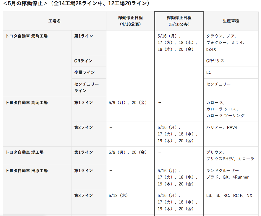 4月18日,丰田汽车在其官网宣布5月日本本土多家工厂将停产数日,并宣布今年5月全球产量将减产10%至75万辆。5月10日,丰田汽车再次宣布,丰田汽车5月全球产量再次减产至70万辆。丰田汽车在其官网表示:受上海疫情封控及供应链短缺影响,丰田汽车从5月16日至21日位于日本本土的多家工厂将停产数日,其中包括位于爱知县丰田市的高冈工厂及位于爱知县田原市的田原工厂等共计8家工厂14条生产线,涉及车型包括丰...